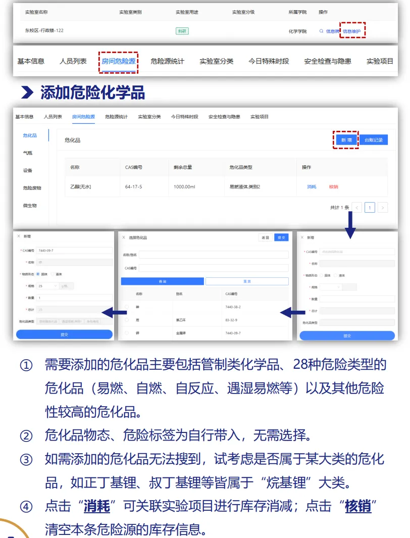 各实验室须在管理系统内填报涉及到的各类危险源,主要包括危化品、气瓶、设备、微生物、危险废物等,具体填报内容如下: