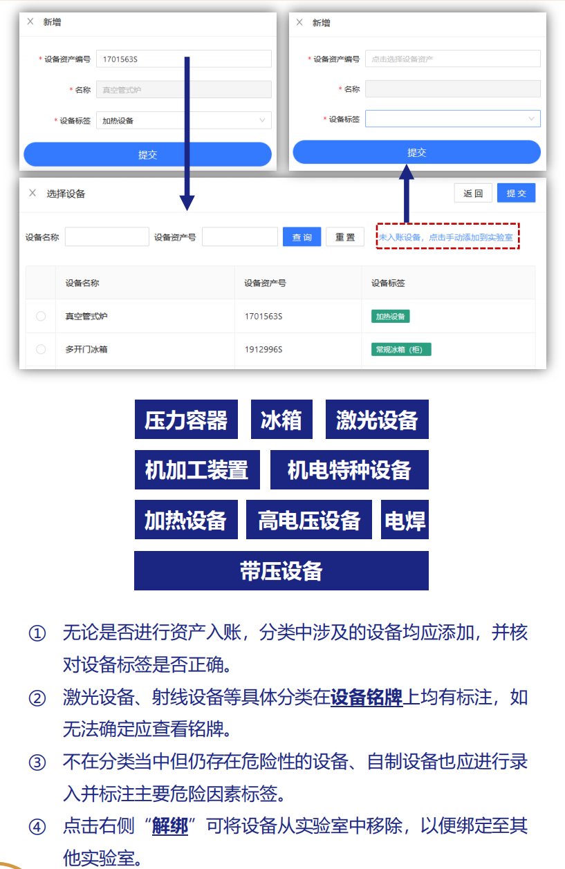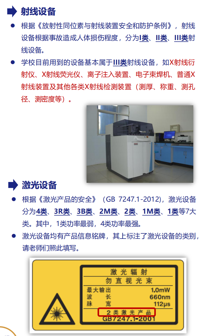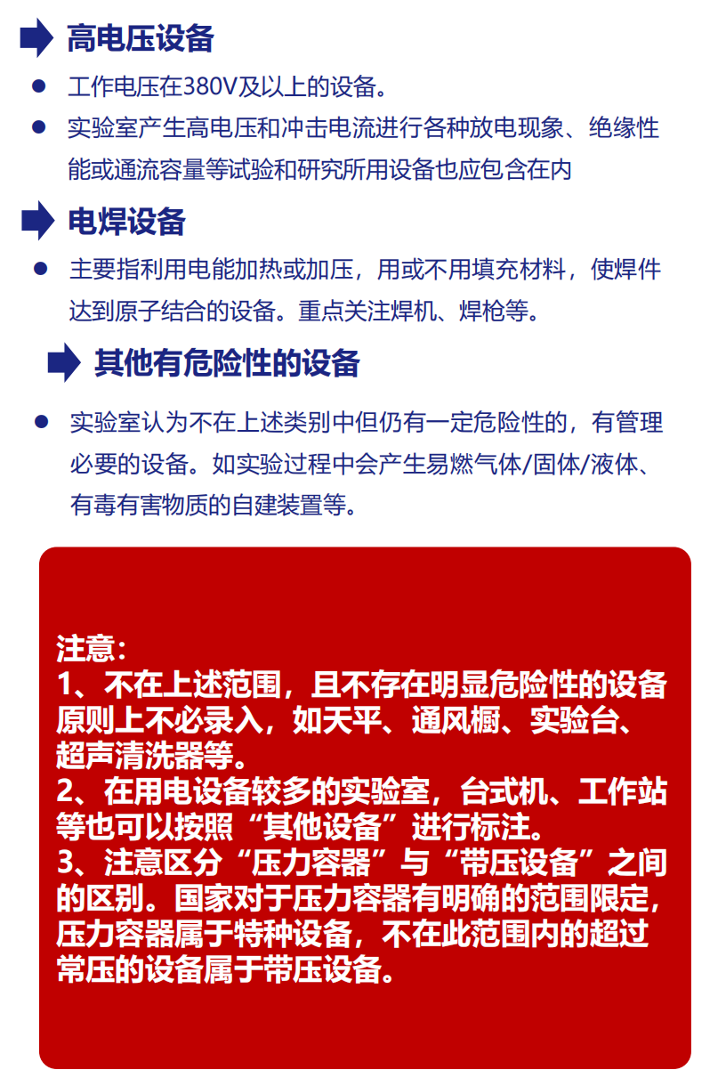 设备:压力容器、激光设备、冰箱、机加工装置、射线装置、机电类特种设备、机电设备、高电压设备、电焊设备、带压设备(非压力容器)及其他设备等;