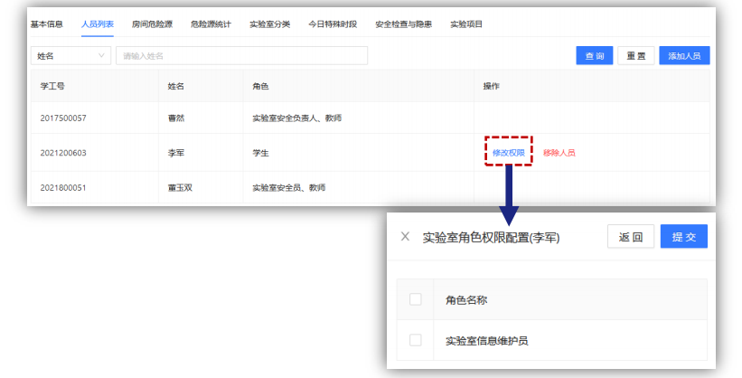 【实验室安全负责人】【实验室安全员】可以向实验室内的老师、学生赋予【实验室信息维护员】权限,以协助填报实验室危险源信息。