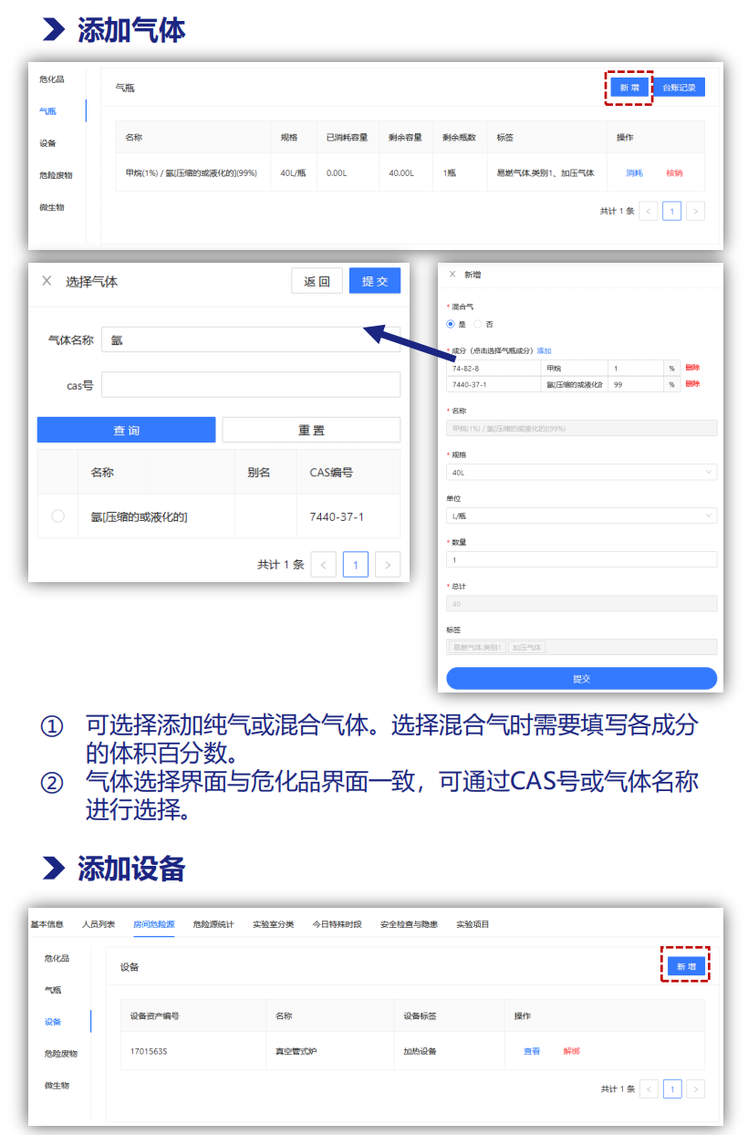 【实验室安全负责人】【实验室安全员】【实验室信息维护员】可以向实验室内添加涉及到的各类危险源,主要包括危化品、气瓶、设备、微生物、危险废物等。