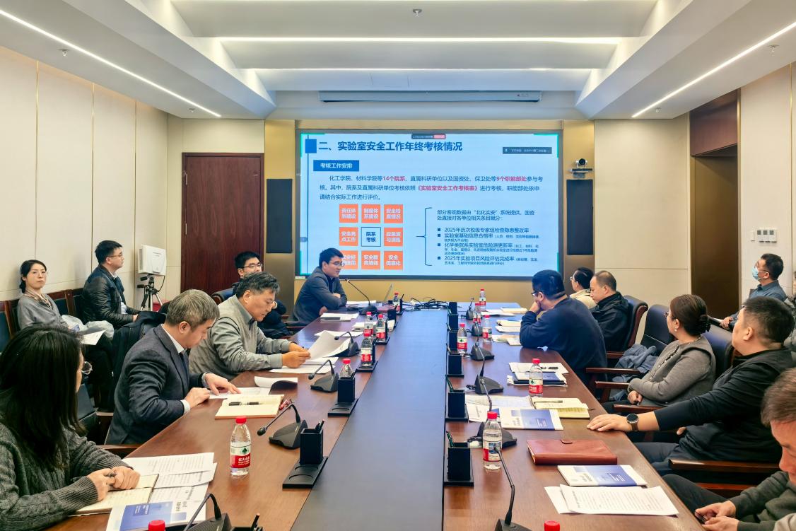 会上,国资处通报了近期实验室安全管理工作的进展情况。与会各单位审议了《2026年寒假实验室安全工作方案》、2025年度“安全与环保工作先进实验室”评选结果及实验室安全工作考核结果,并对有关事项进行了讨论。